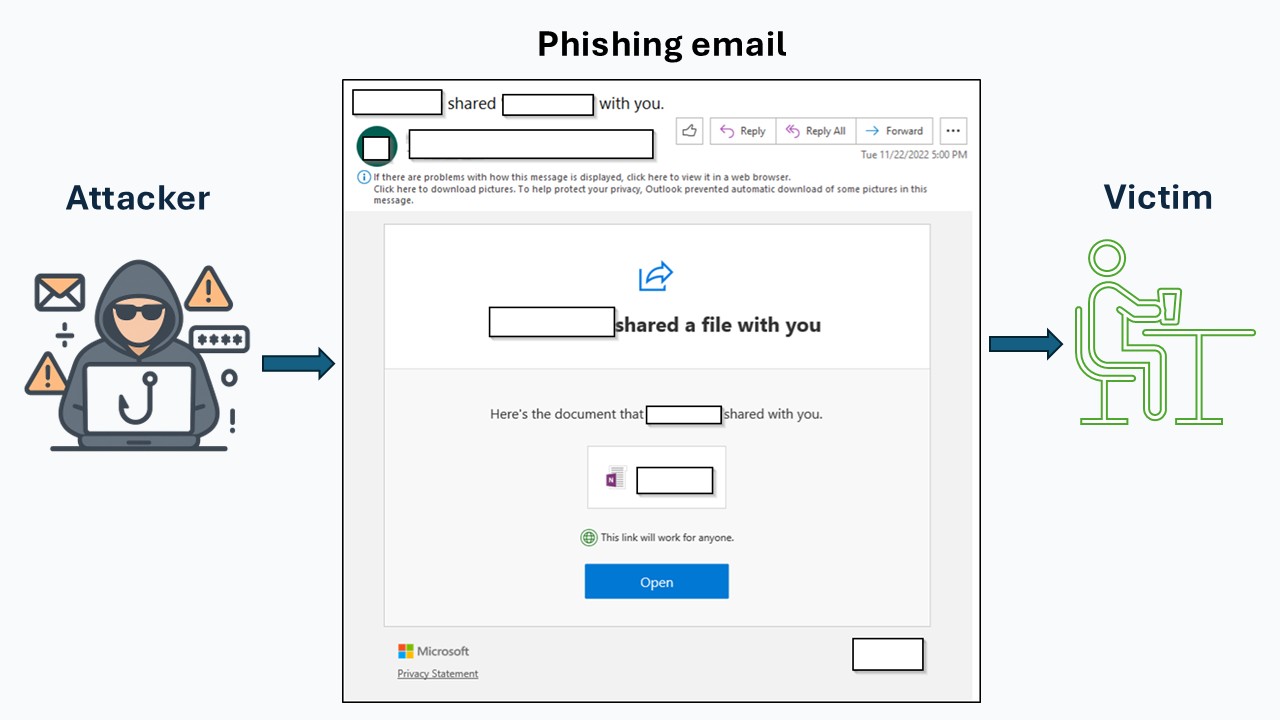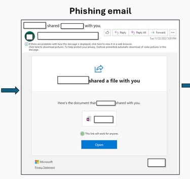 The victim receives a phishing email, often appearing to come from a trusted contact whose account was already compromised. The message typically urges the user to take urgent action (view a file, reset a password, review an invoice, etc.).