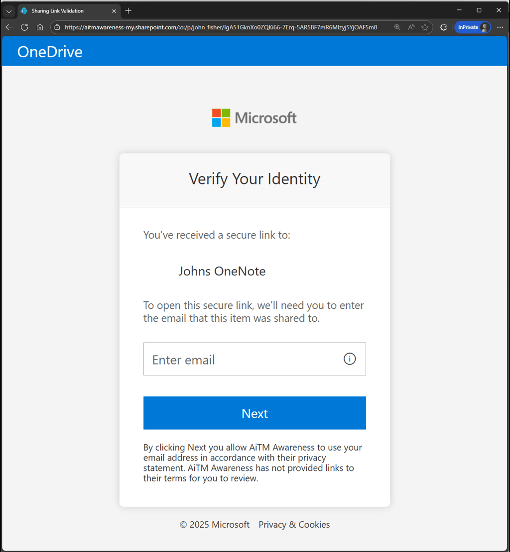 Attackers frequently abuse Microsoft OneDrive and OneNote to host initial landing pages.